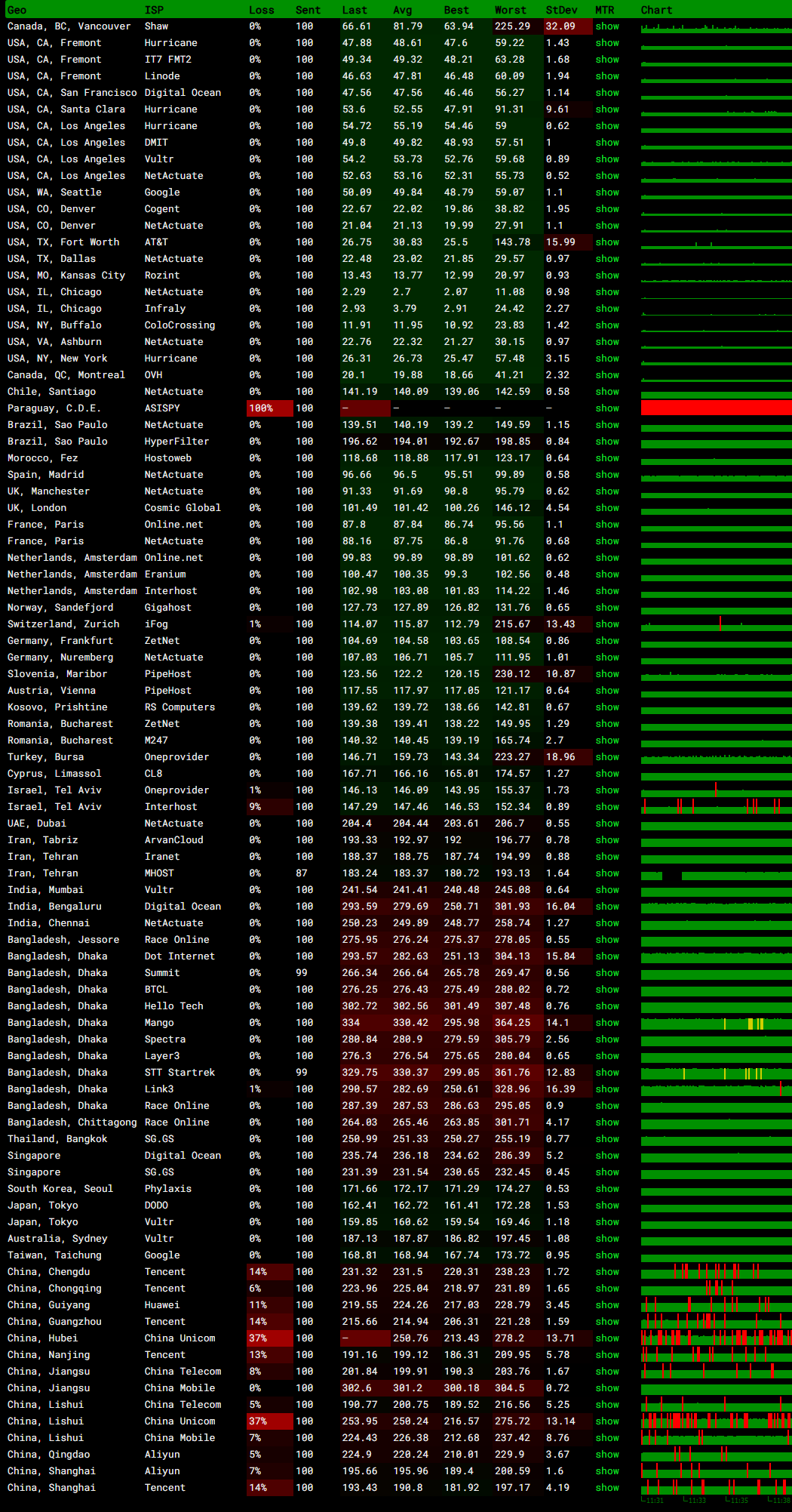 20 | 154.54.81.65 | 美国伊利诺伊州芝加哥 cogentco.com | AS174 | 673.3 / 702 / 737.1 |