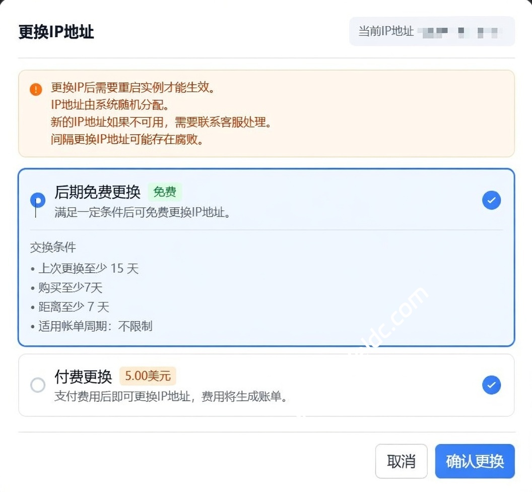 - 其他提醒: 更换 IP 前备份重要数据;新 IP 上线后,原 IP 立即失效;不支持指定 IP,仅随机分配。