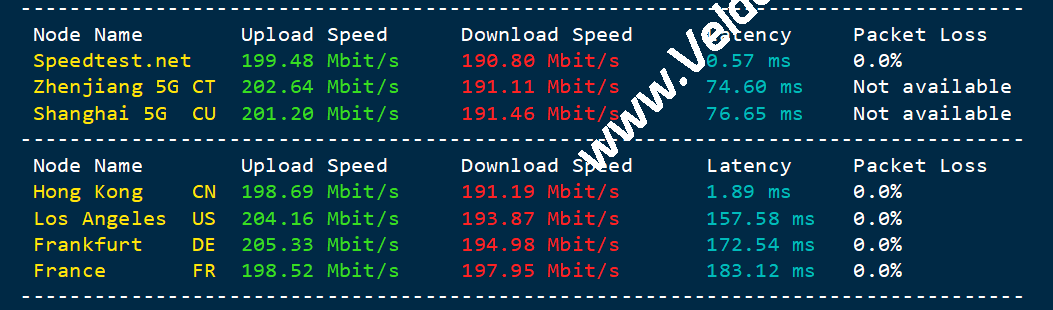 该服务器上行(Upload)与下行(Download)带宽均稳定在 200 Mbps 左右,符合官网宣传,这在香港轻量云产品中属于极高规格,非常有利于大文件的上传与分发。