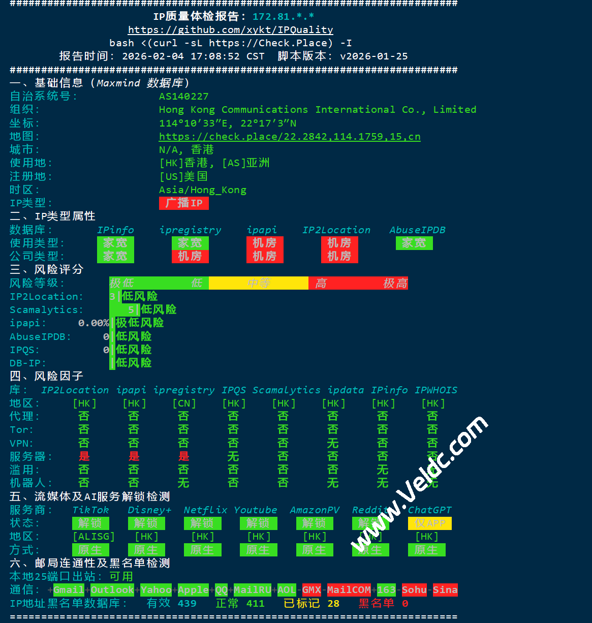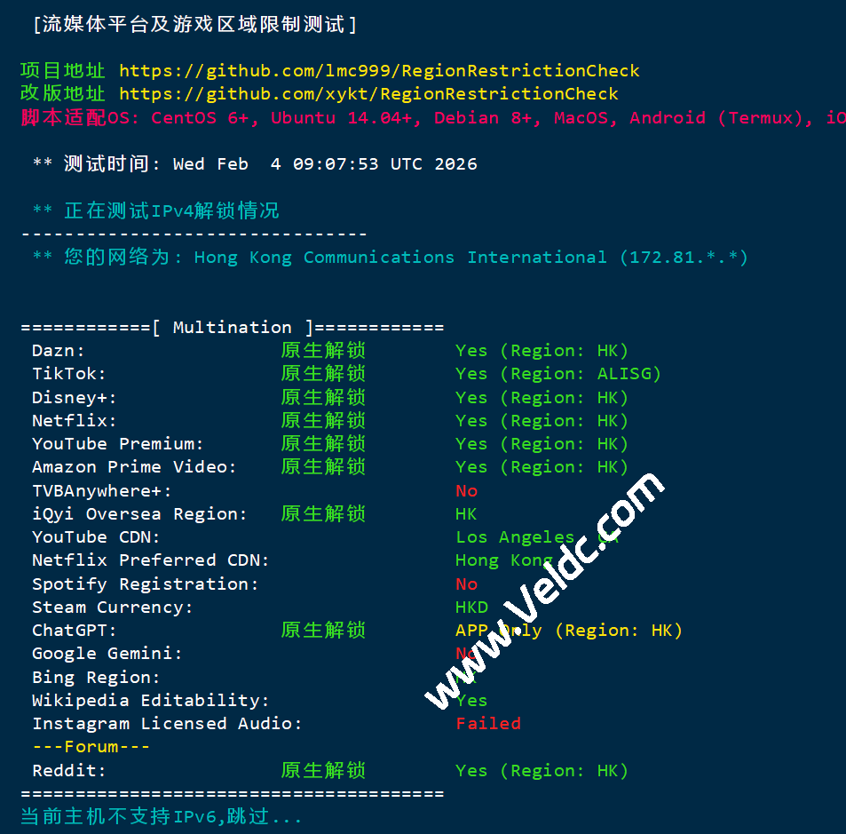 该服务器在香港地区的流媒体解锁表现非常出色,基本覆盖了主流的国际及区域性平台,尤其适合需要 Netflix/Disney+ 香港区内容 以及 B站港澳台限定 的用户。如果主要用于网页版 ChatGPT 或 Google Gemini 开发,建议配合其他节点或联系服务商确认 IP 段的最新的 AI 兼容性。