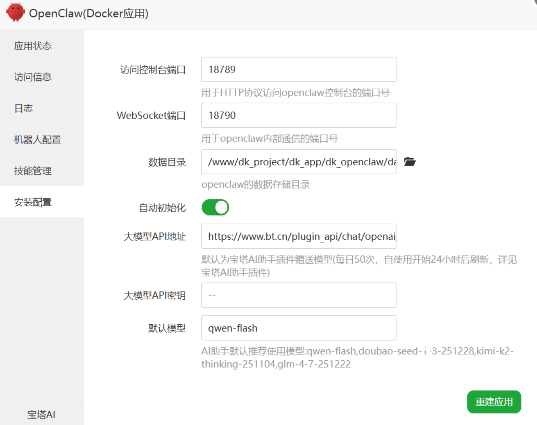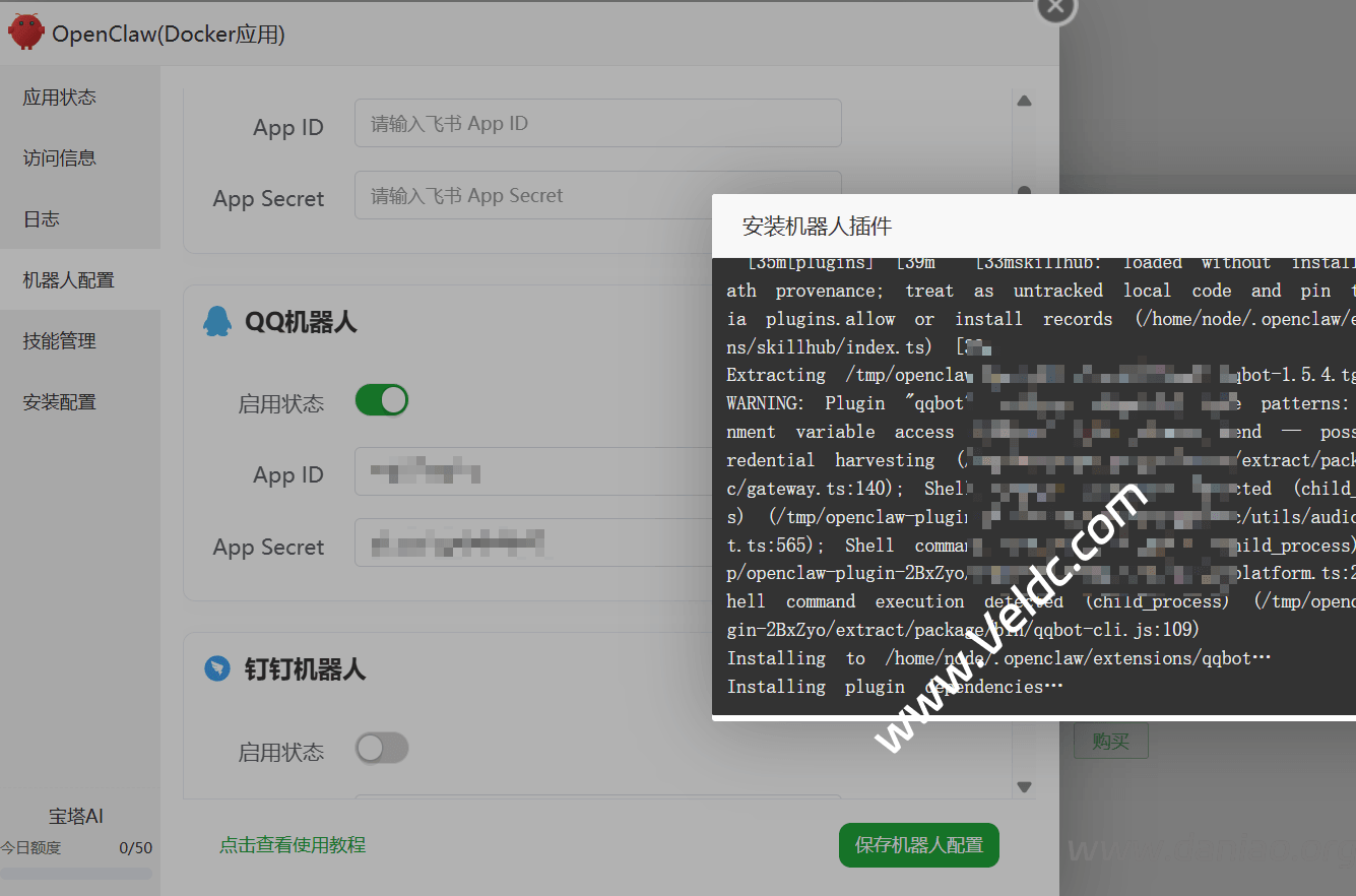 打开openclaw,docker应用后,可以看到:应用状态、访问信息、日志等。