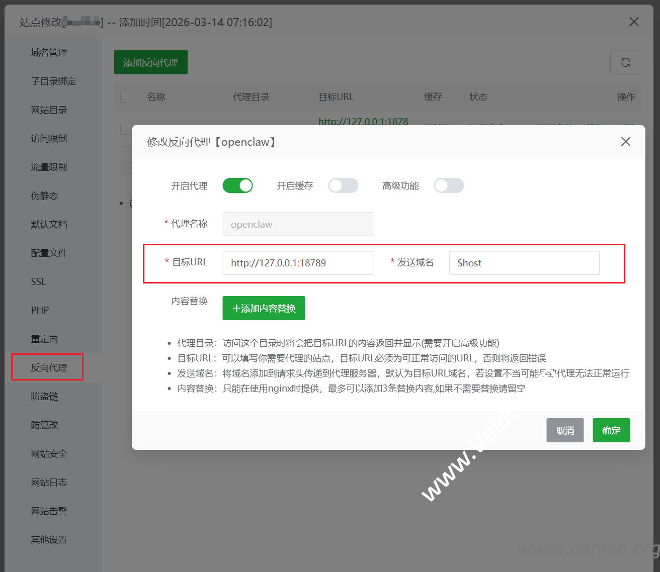 前面都没有使用域名略微不方便,可以利用宝塔“饭袋”域名即可。宝塔新建站点略过。在网站管理页面点击右侧的“设置”,之后点击方向代理,看图: