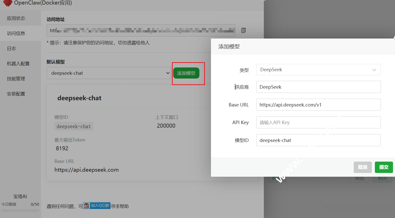 访问信息里有访问地址和添加模型,如图: