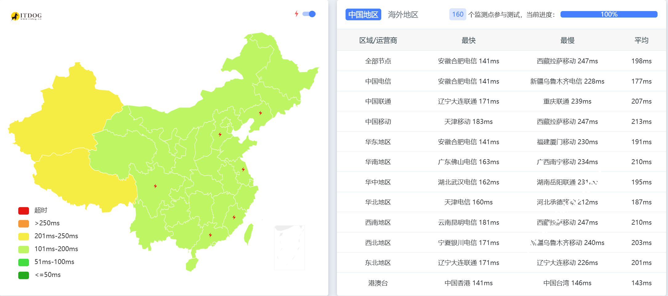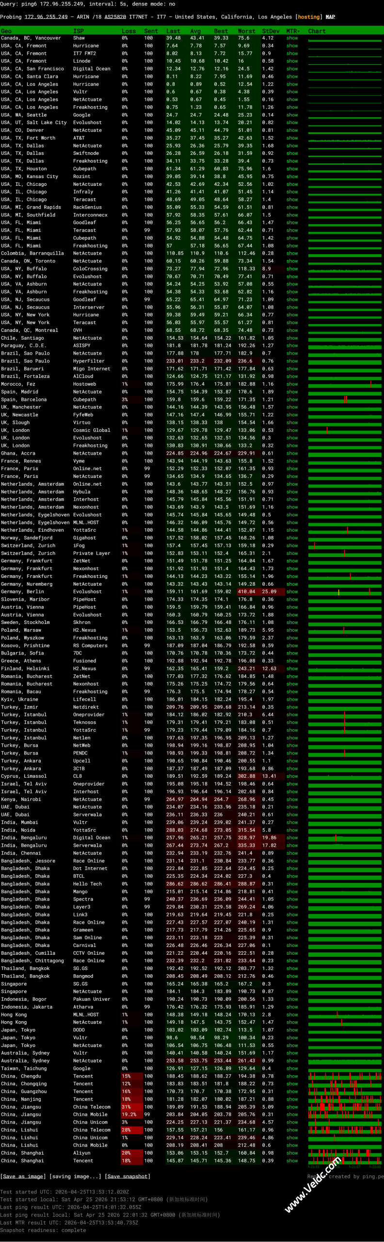 ping.pe全球各地网络稳定性情况: