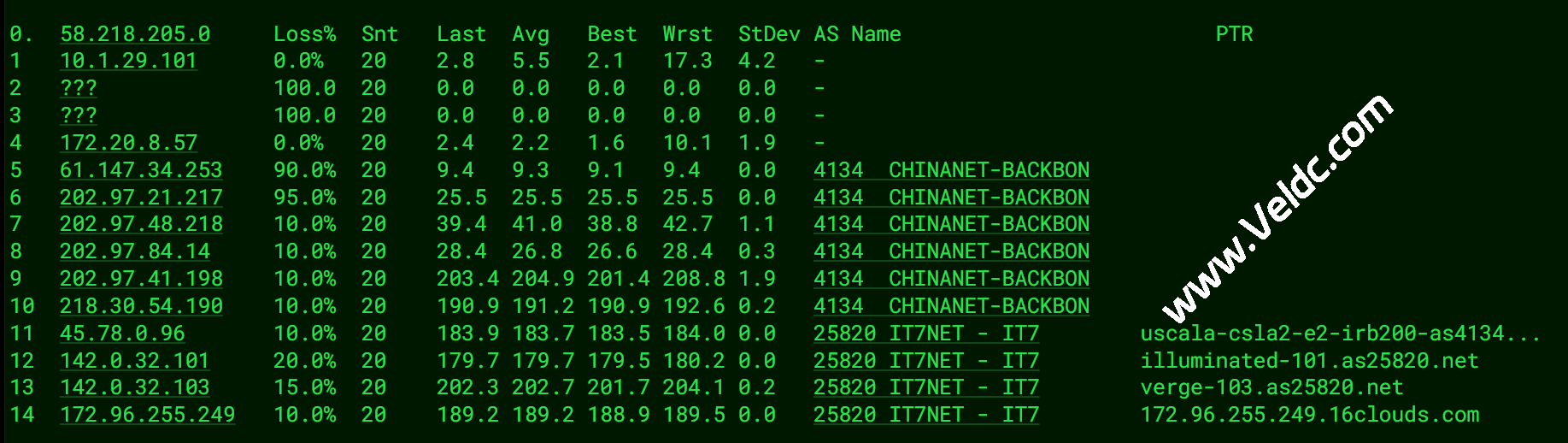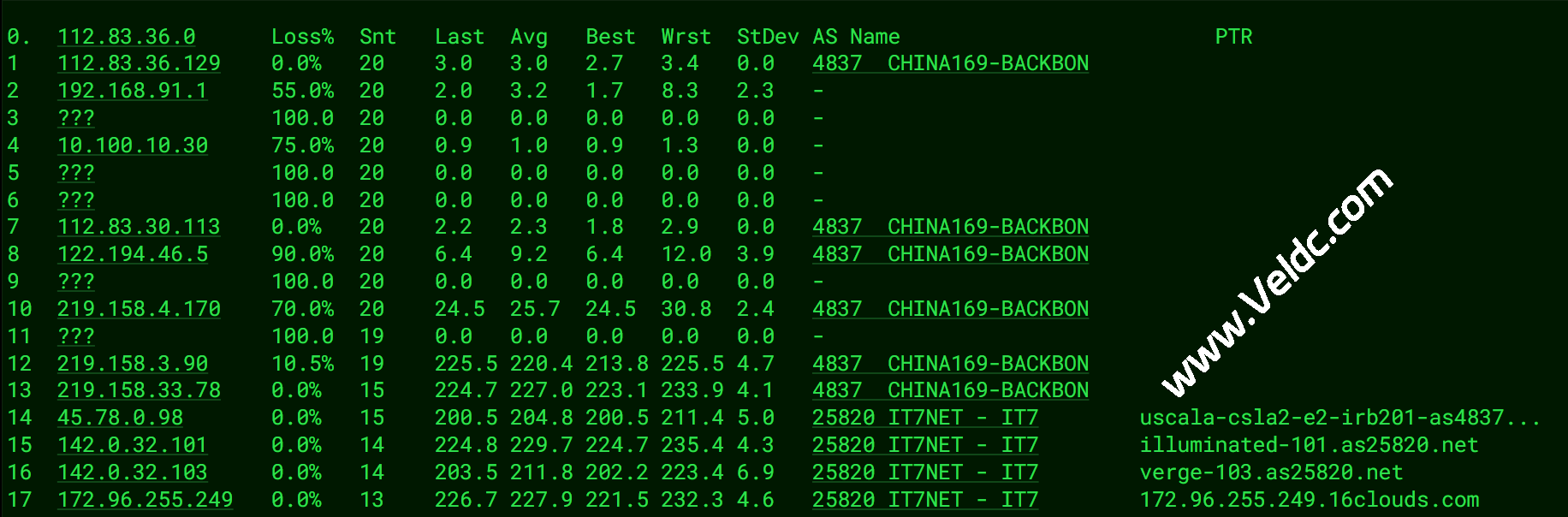这是联通最基础的骨干网线路。虽然不是定位高端的联通 9929(A 网),但 4837 线路在处理跨境流量时,其出口带宽相对于用户基数来说比较充裕,因此在晚高峰的表现通常优于电信 163。相比电信线路 10%-20% 的丢包,联通这条线在同样的时间点(晚上 10 点左右)相对稳定。