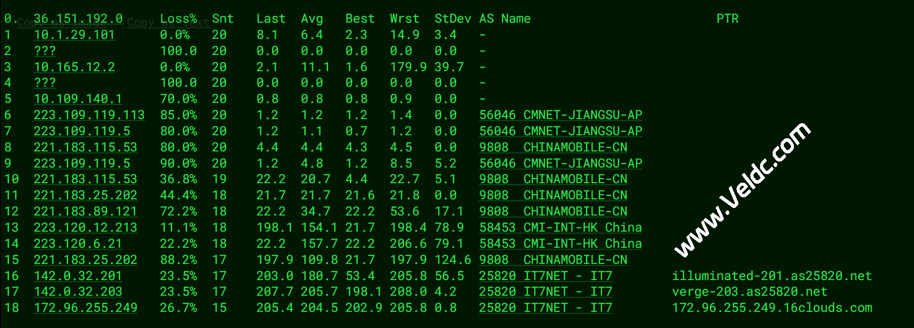路由采用了 中国移动 -> 香港 CMI -> 国际出口 -> 海外机房 (IT7) 的路径。丢包极度严重。全段几乎每个节点都有 20% 以上的丢包,尤其是中国移动骨干网部分。这种数据表现下,实际的网络连接(如 SSH、网页浏览或游戏)会感到明显的卡顿、断连和高延迟波动。